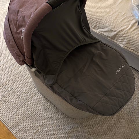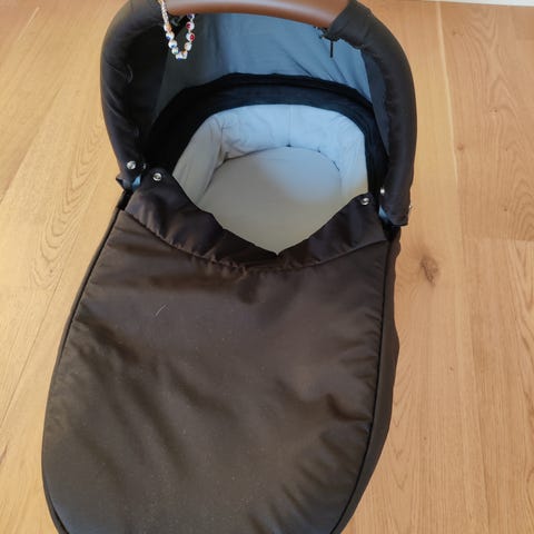 Petite Cherie barnvagnsliggdel i beige färg. Tillverkad med quiltad design och har ett handtag med brunt läderimitation. Passar som liggdel till barnvagn.