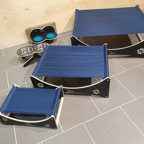 Kattsäng i form av ett litet hus med beige tygklädsel. och kan användas som sovplats eller viloplats inomhus.