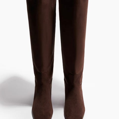 Stövlarna är tillverkade i brunt mockamaterial och har en dragkedja på insidan för enklare på- och avtagning. Designen inkluderar en låg klack och en spetsig tå.