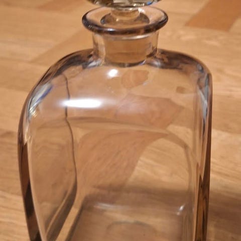 Grön glas karaff med fyrkantig form och matchande lock. Karaffen har en slät yta och är genomskinlig med en grön ton. Passar för förvaring och servering av drycker.