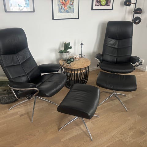 fåtölj med fotpall, svart skinn