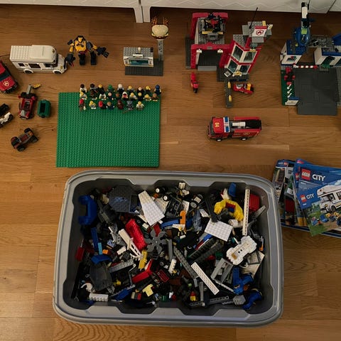 LEGO byggsatser och figurer från olika teman och modeller. Innehåller olika bitar, fordon och karaktärer i varierande storlekar och färger. Passar för samling eller lek. Ca 7-8kg