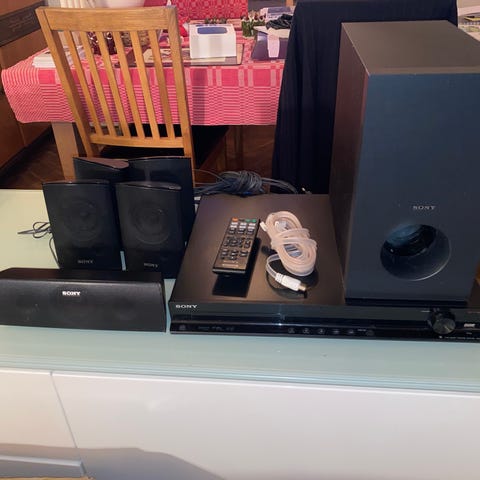 Består av en subwoofer och 5 mindre högtalare (satelliter) pris 300 el bud! Hämtas helst nu och senast idag! då det står i vägen för dammsugaren!