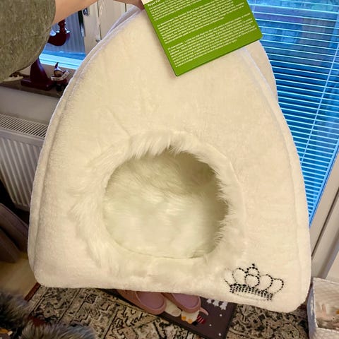 Mjuk katt- eller hundbädd i grått och vitt material med en kupolformad design. Bädden har en avtagbar kudde och en öppning framtill för enkel åtkomst. Passar små till medelstora husdjur som söker en mysig viloplats.