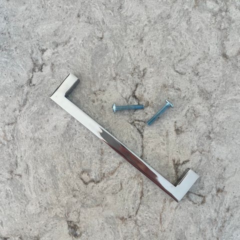 IKEA handtag i metall, lämpligt för möbler och skåp. Handtaget har en rektangulär form och är designat för att monteras på möbler för att underlätta öppning och stängning.