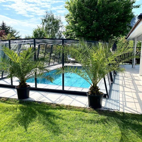 Vi rekommenderar modellen DOMINICANA – ett aluminium-pooltak med transparent polykarbonat.