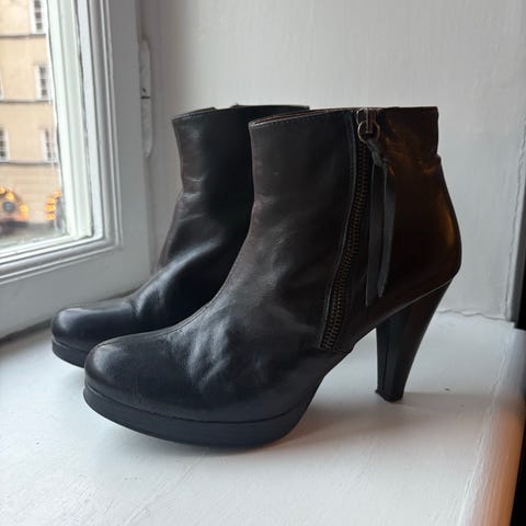 Jag säljer mina högklackade finskor i brunt läder. Stl. 39, använda en gång och därför i mycket gott skick. Nypris 1300 kr. Klack 8 cm hög. Stabila och eleganta.