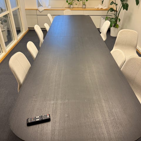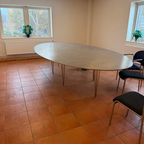 ger bort ett stort och stabilt konferensbord i ljus träfinish med kromade ben.