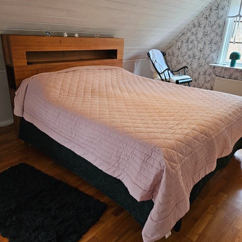 Sängbord i teak med metall/stringben. Har originellt varit "Floating shelves" från brittiska tillverkaren Beaver & Tapley.