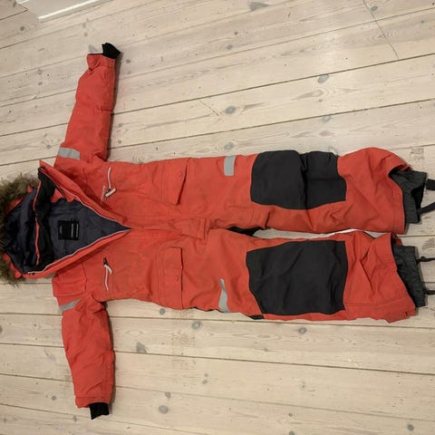 Tvättad varsamt, 30 grader ut och in. Finns därför lätt smutsning kvar på mage och nedre ben. Yttertyget trampat på i nederkant baktill, inget som stör vattentät funktion dock. Snölås intakta.