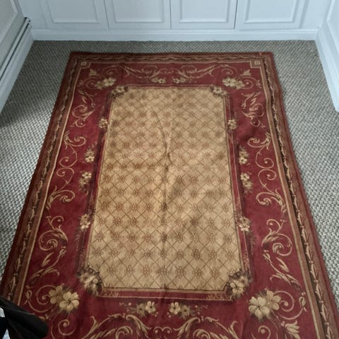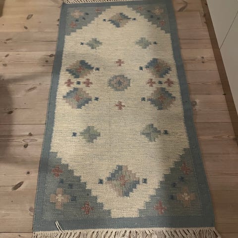 Retro matta med vågformad design i beige, blå och orange färger. Mattan har en unik form med cirkulära och böljande mönster. Passar för användning som golvdekoration i vardagsrum eller liknande utrymmen.