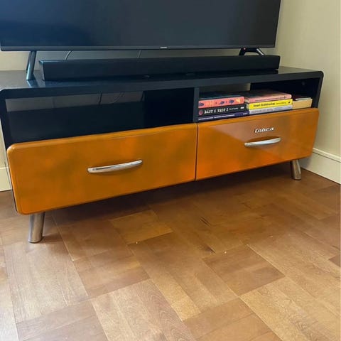 Liten skada i ett av nedre hörnen vilket man kan se på bilderna men det är inget som syns när den sitter på tvn då den är i neder kant