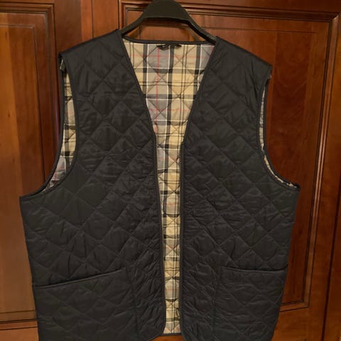 Burberry jacka i storlek M för herrar, tillverkad i bomull. Jackan är grå med quiltad design och har flera fickor. Passar för utomhusbruk.