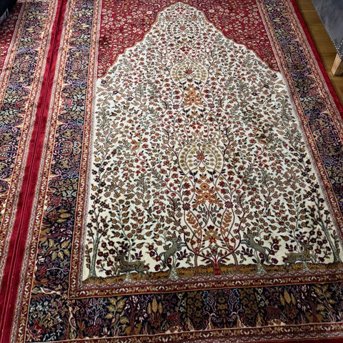 Handvävd unik matta med ett färgglatt lövmönster i olika nyanser inklusive grönt, gult, rött och blått. Mattan har en rektangulär form och är placerad på ett trägolv. Passar för användning som golvbeläggning i olika rum.