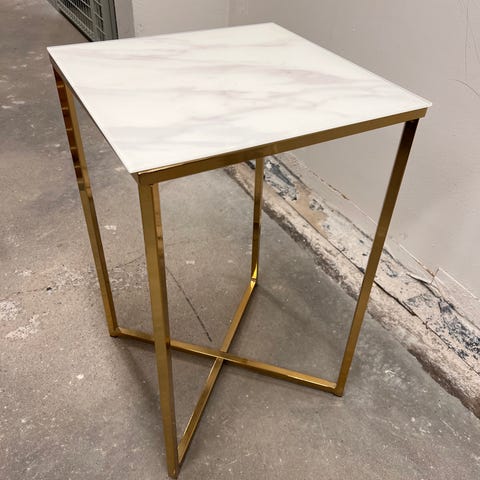 Låda under halva borde och en hylla under andra halvan, samt en extra hylla.