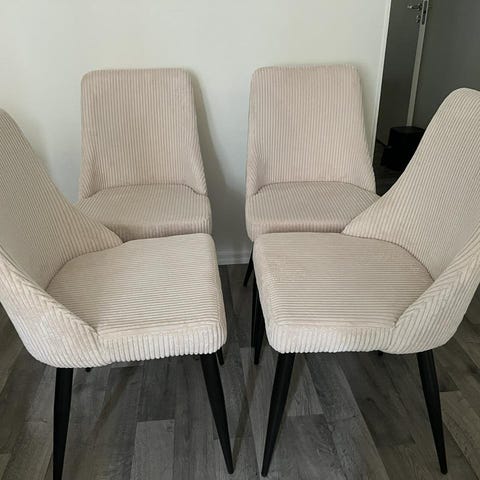 Säljer 3stycken stolar i beige sammet för 600kr (200kr/st). Har en 4:e som har fått fläckar som jag inte vet vart dom kommer ifrån eller hur man får bort dem så denna stol följer med gratis.
