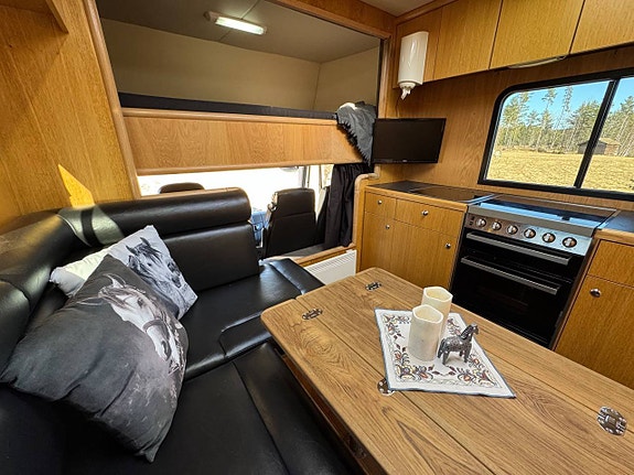 Nedfällbar säng ovanför hytten, säng ovanför duschen och möjlighet att bädda ner bordet till säng