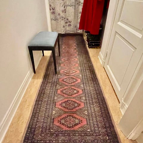 Handknuten Afghansk matta löpare från 70 talet med geometriskt mönster i bruna och svarta nyanser. Löparen har fransar i ändarna och är lämplig för användning i hall eller gång.