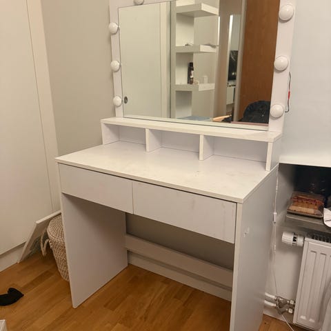 Vackert lågt bord med 4st lådor. Designad av IB Kofod Larsen för brittiska tillverkaren G-Plan. Originellt ett sminkbord med spegel, men spegeln har blivit av monterad och finns ej att köpa. Kan möjligen fungera som lågt skrivbord eller som sminkbord under en väggmonterad spegel.