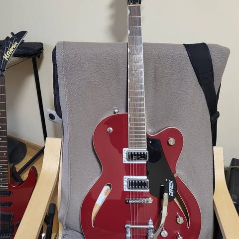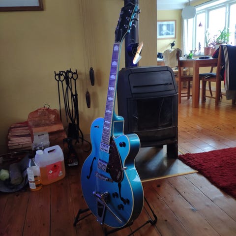 Mycket trevlig jazzburk, endast stått i studio i flera år. Behöver nya strängar men är annars justerad med behaglig ganska låg stränghöjd.