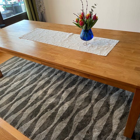 Matbord i trä med en rektangulär bordsskiva. Bordet har en naturlig träfärg och passar för matplats i hemmet.