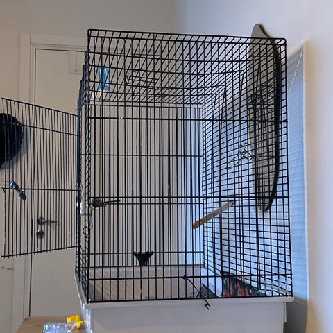 Svart metallbur avsedd för fåglar. Burens konstruktion består av metallstänger med dörrar för åtkomst. Kan användas som fågelbur inomhus.