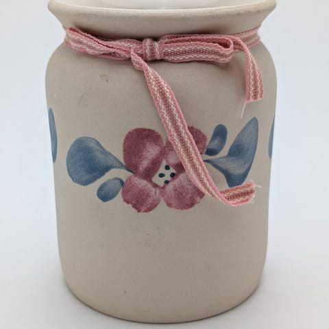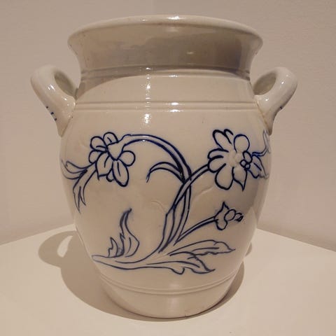 Kruka i keramik modell enligt bilder. Dekorerad med linneor.