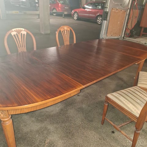 Utemöbelset bestående av ett bord och fyra stolar. Bordet har en träskiva av teak och stolarna har karmar och överdeal i teak, övriga delar i svart metall. Bordet är 90*152 cm i vanligt läge med plats för fyra. Ett infällt mellanlägg förlänger bordet till 210 cm och plats för 6 personer. Stolarna har metallramar och svarta dynor. Teakytorna har en vacker patina, de har behandlats med teakolja varje säsong. Nypris för motsvarande set idag på Trademax 15900:-