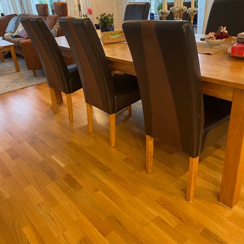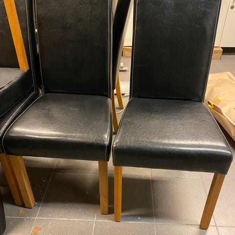 Säljer 8 st svarta stolar med silvriga ben. Stolarna är egentligen inte särskilt mycket använda, men eftersom de har stått upp och ner på bordet har konstlädret tyvärr börjat flagna och fått en del skavanker. Alla stolar har därför visst slitage, men de är fortfarande stabila och fullt användbara. Perfekt för dig som vill ha ett prisvärt set stolar eller som planerar att klä om dem själv.