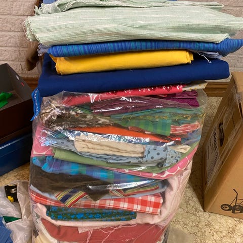 Set med barnsängkläder i olika färger och mönster, inklusive motiv som Minnie Mouse, stjärnor och djur. Material och storlek varierar mellan delarna.