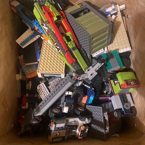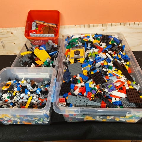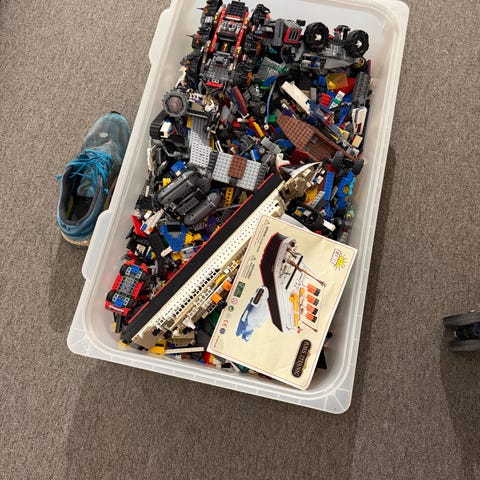 Blandat, allt möjligt, technic, star wars, city, etc. Skickar i papplåda med sopsäck inuti. Plastkartong på bild ingår ej.