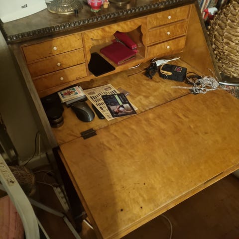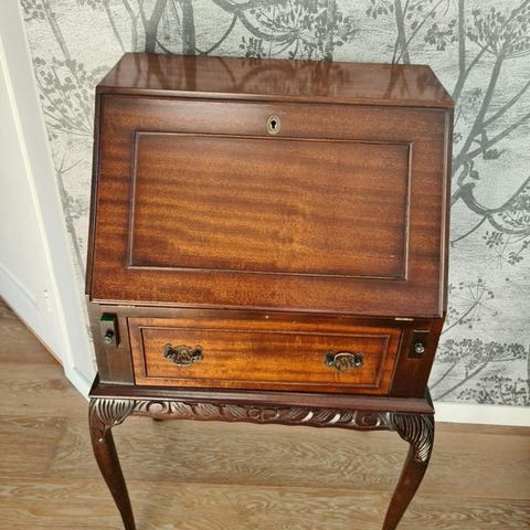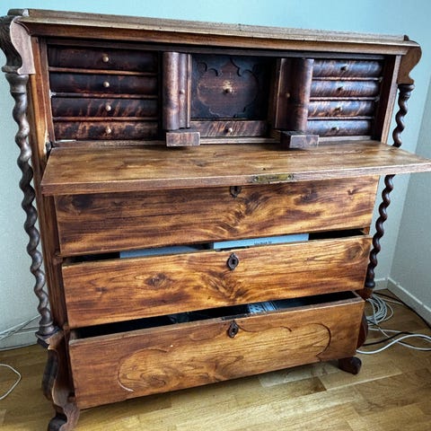 Chiffonje, sekretär ”farfars skrivbord”. Kvalitetsmöbel från Ruben Widman. Förutom skråmor enligt bilder fint helhetsintryck i rummet och härlig lyster i faneret som inte syns på bild. B:85 H:102 D:(längst ner) 40. Skrivbord utfällt djup ca 72 totalt, skrivbordsyta omkring 45. 4:e våningen, dessvärre ej hiss, men kan hjälpa till nerför trapporna.