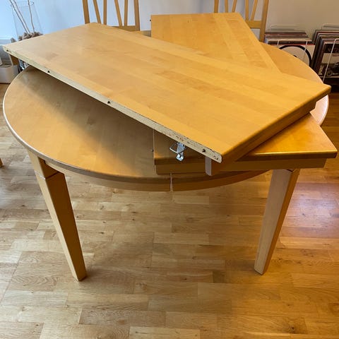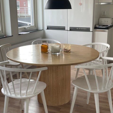 Runt matbord från tyska Läsko exklusiv model i askfane’r med 2 iläggsskivor (50 cm styck). 6 st italienska stolar i homogen björk. Tillfälle!