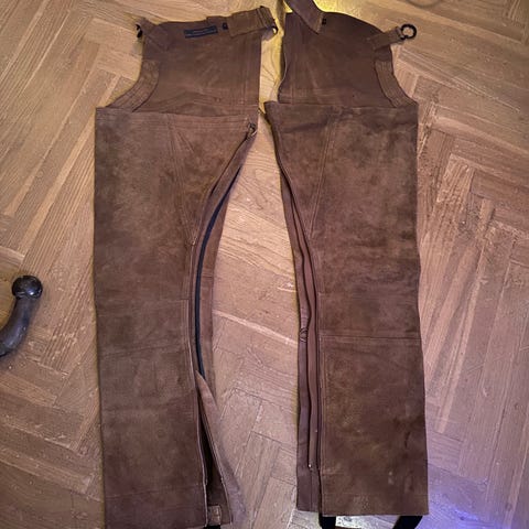 Jackson Chaps i svinmocka. Använda men i fint skick. Hällor nertill. Mått inre ”benhalva” 72 cm. Midja kan ändras från 43 cm till 32 cm .