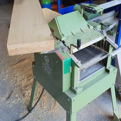 Casadei typ R63. Hyvelbredd 630mm. 10-hk motor. Elhöjning. Utrustad med sektionell inmatning, 4-stålskutter och slipmaskin.