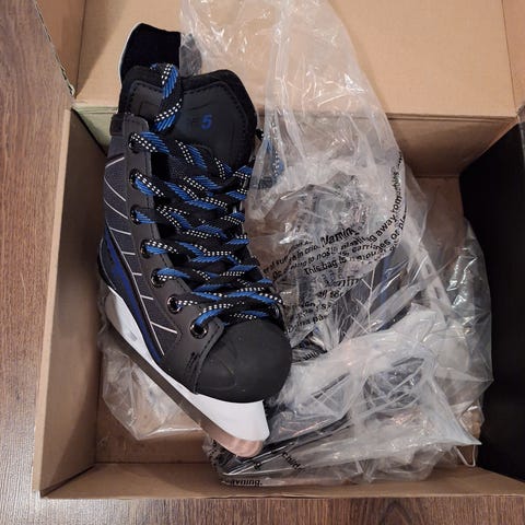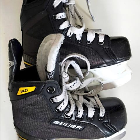 Två par skridskor i storlek 28. Perfekt paket för en nybörjare. Ett par hårda skridskor med ett enkelt spänne och ett par mjukare skridskor med vanlig snörning.