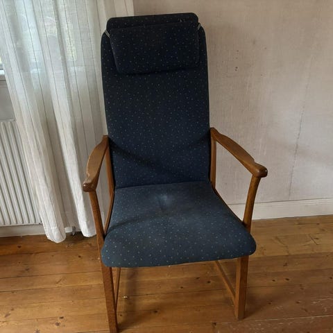 Vacker fåtölj i ljusrosa original tyg formgiven av Carl Malmsten. Fint skick och väl bevarad. Anses av många vara ’världens vackraste fåtölj’ Modellen heter Vår Fru’ Stämpel finns på undersidan av fotöljen.