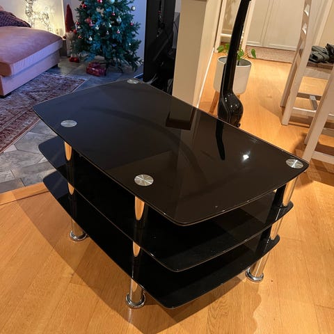 Designad tvbänk som skulle fungera ypperligt som en mindre bardisk, inbyggda ljussken.