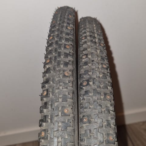 Ett däck har torrsprickor men har mycket kvar att ge och ett är i nyskick.