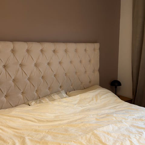 Grå/beige sänggavel till en 180 säng. Säljs billigt mot hämtning. Bild 2 är färgen i dagsljus, bild 3 är färgen i kvällsljus. Finns slitage, se sista bilden.