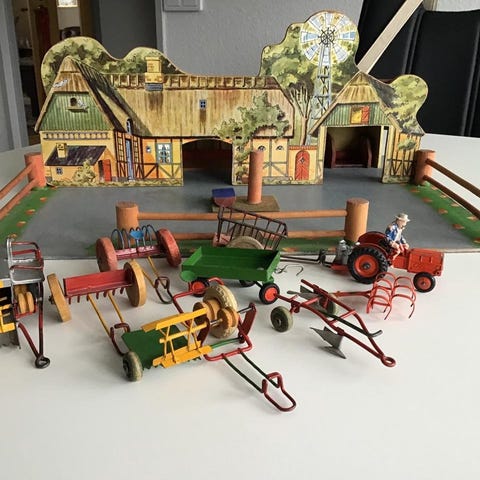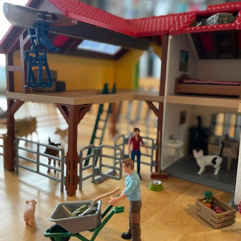 Brio Bondgård lekset med flera djurfigurer inklusive ko, häst, kalv, get och gris. Setet inkluderar en bondgårdsbyggnad med röd fasad och gult tak samt ett mindre skärmtak. Leksetet är tillverkat i trä och plast och är avsett för barn.