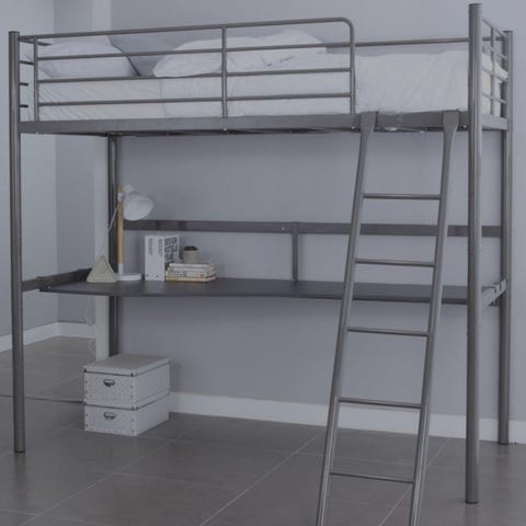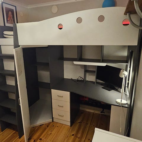 Löftsäng med integrerat skrivbord och förvaringsutrymmen i fuchsia färg. Sängen har en övre sovplats med räcke och en utdragbar skrivbordsdel. Förvaringen består utav ett mindre förvaringsskåp med dubbla dörrar, en hylla med två plan och tre stycken utdragbara lådor.