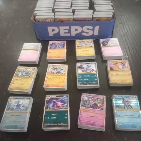 En samling av Pokémon samlarkort med olika karaktärer och holografiska effekter. Kortens baksidor visar den klassiska Pokémon-logotypen och Pokébollen. Kortens storlek och material följer standard för samlarkort.
