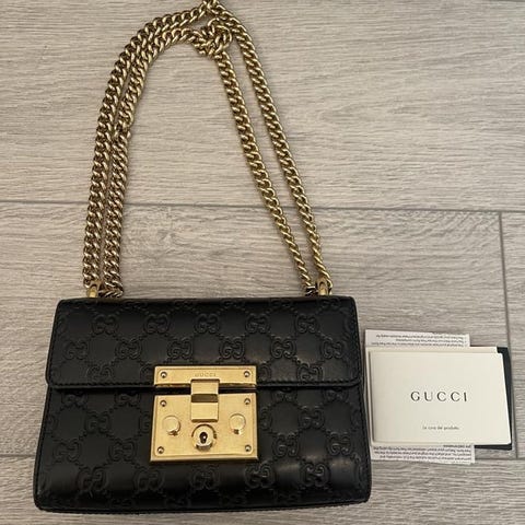 Gucci läderväska för kvinna. Väskan är tillverkad i läder och canvas och har en kombination av svart och beige färg med guldfärgade detaljer. Den har en kedja som axelrem och ett lås med Gucci-logotyp. Levereras med originalförpackning och skyddspåse.
