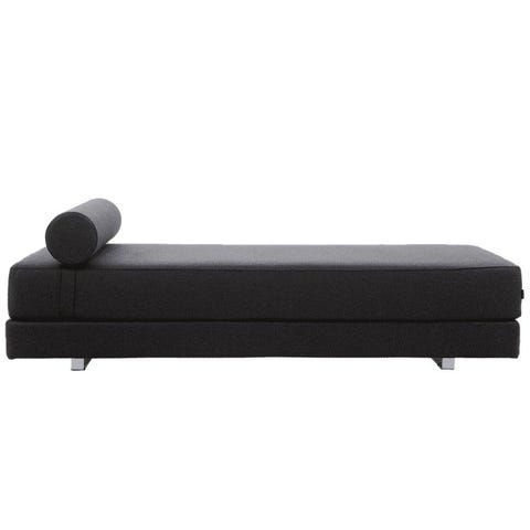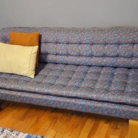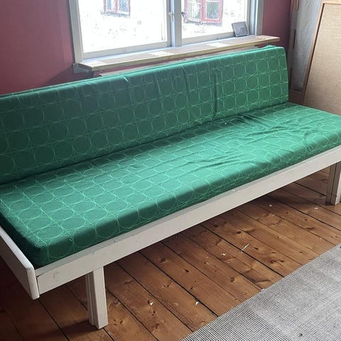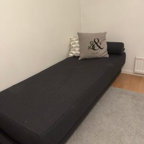 Med tillhörande förvaringslåda. Brun med linneklädsel. Stått i gästhus, sparsamt använd. Tyget ser ut att vara avtagbart, har blixtlås. Mått ca 200x80, bäddmått utfälld 200x150cm.