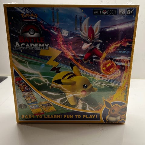 Pokémon Battle Academy brädspel med spelplan, kortlekar och spelregler. Spelet är utformat för att lära spelare att spela Pokémon Trading Card Game och innehåller instruktioner och material för att komma igång med spelet.dok tre av de viktigaste korten finns inte med men är ett riktigt kul spel att spela med sina barn