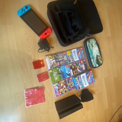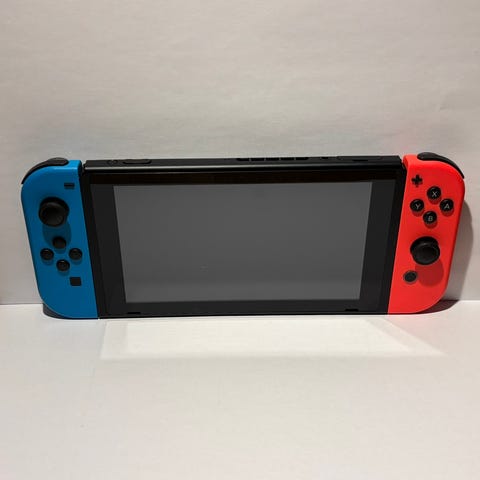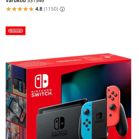 Nintendo Switch spelkonsol med Joy-Con-kontroller i röd och blå färg. Konsolen har knappt används och ersattes med en steamdeck därav säljs denna.