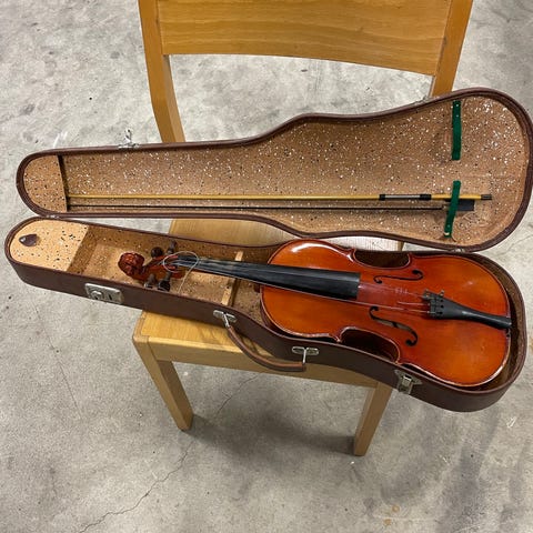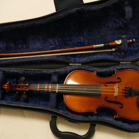 Troligtvis tysk fabriksfiol från tidigt 1900-tal. Cirka dm lång spricka bredvid stränghållaren. Tunt lock. Renoverad av Karl Sahlström 1976. Endast för avhämtning.