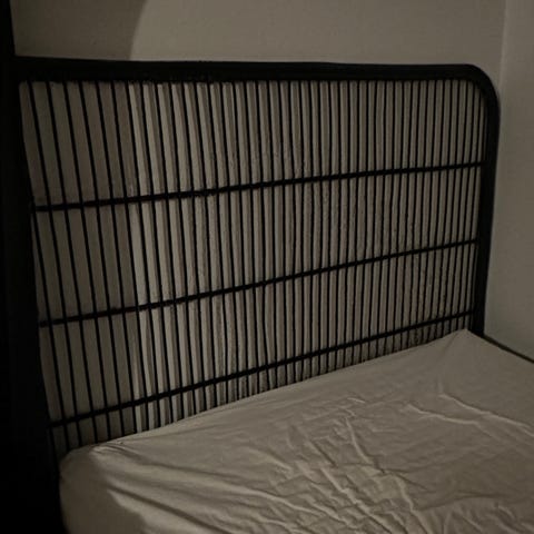 Rustik fräsch sänggavel med tillhörande sängbord i nyskick.