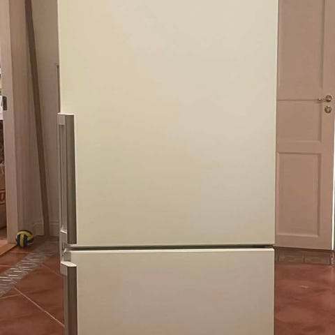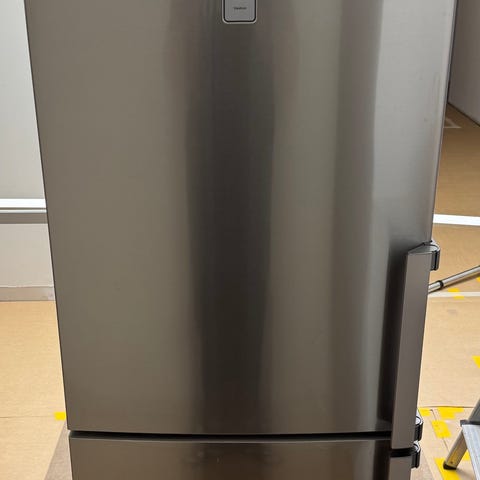 Samsung kombiskåp med kyl- och frysfunktion. Rostfri yta med digital display på dörren för temperaturkontroll och inställningar. Inredningen inkluderar glashyllor och dörrfack för förvaring av olika livsmedel och drycker. Energieffektiv design med flera fack för separat kyl- och frysförvaring.